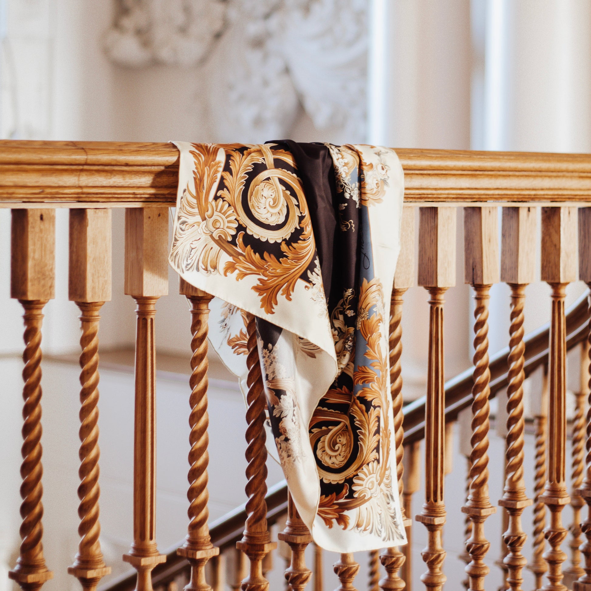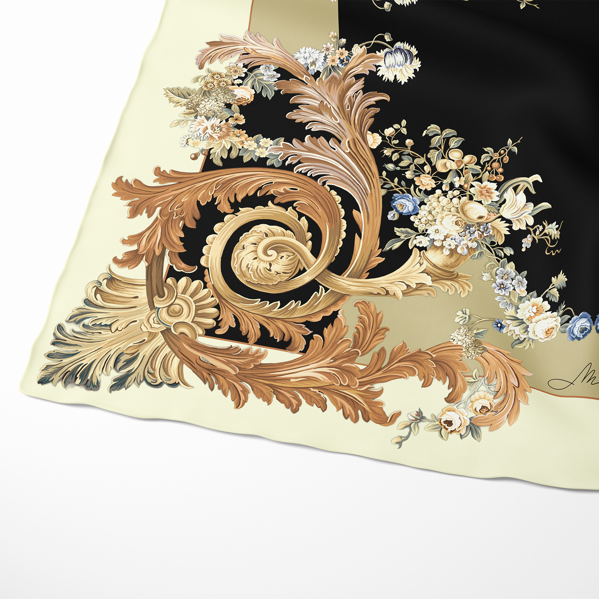 Baroque Garden is opulence, refined. Crafted from 100% silk twill in a rich 16mm weave, this piece is a dramatic collision of historical grandeur and sharp modernity. The design is framed by elaborate, hand-drawn rococo scrolls and rich gold foliage, creating a powerful architectural border. This rich detail surrounds a vibrant floral vignette set against a striking, intentional field of deep black. This scarf delivers commanding presence. Use it as the defining centrepiece of your look, instantly translating dramatic luxury into effortless, high-fashion style.