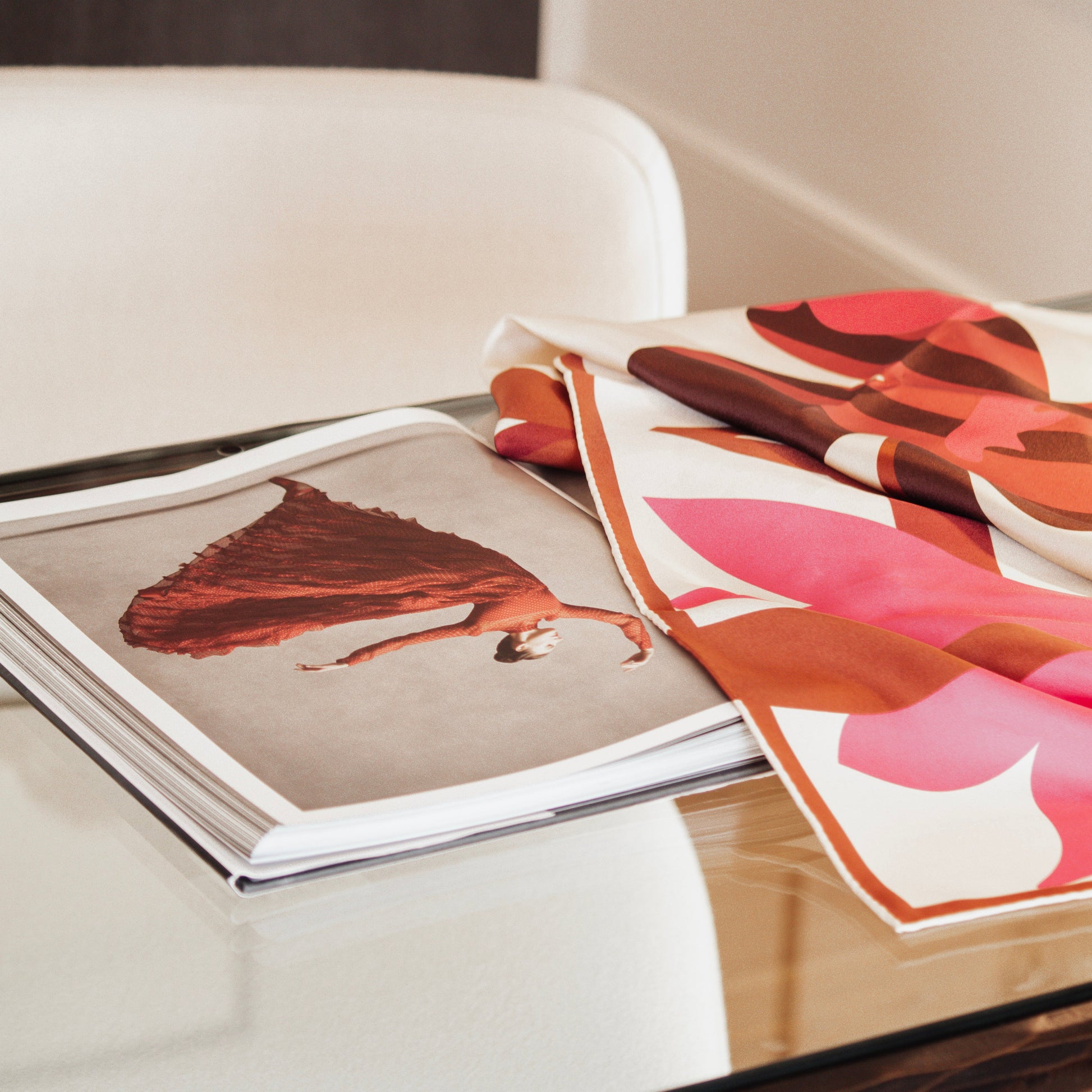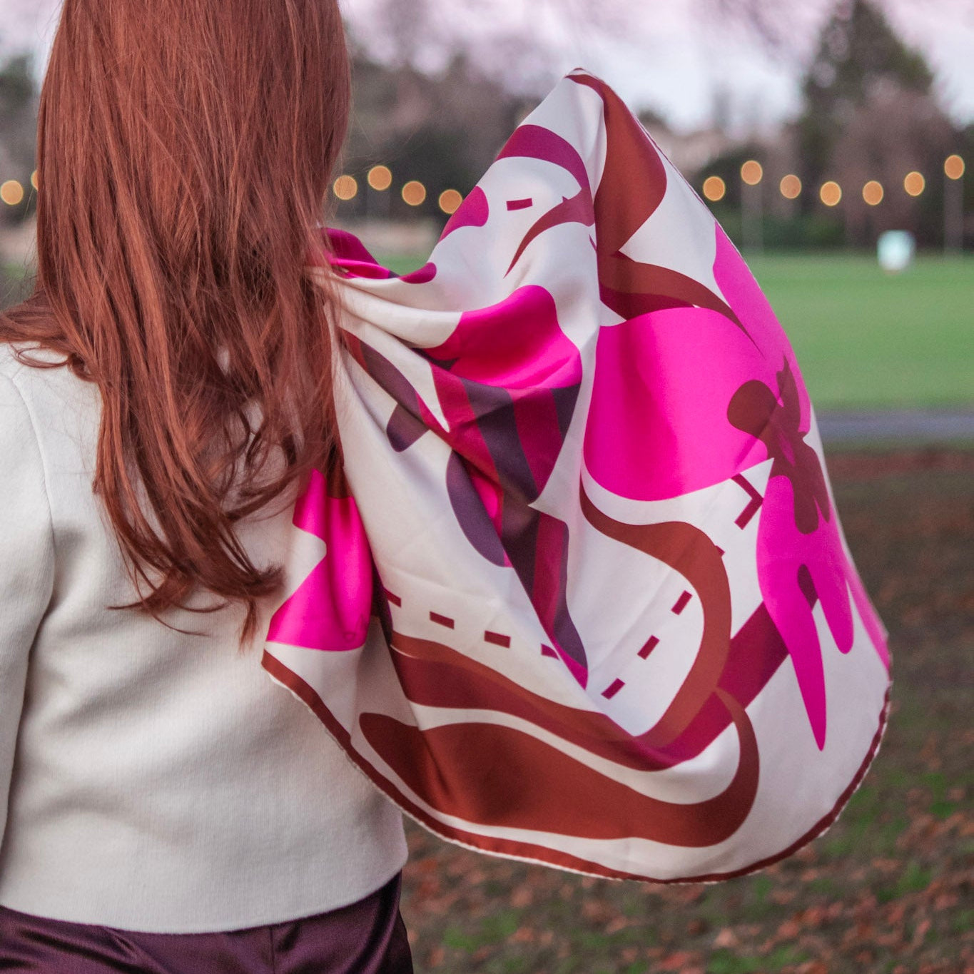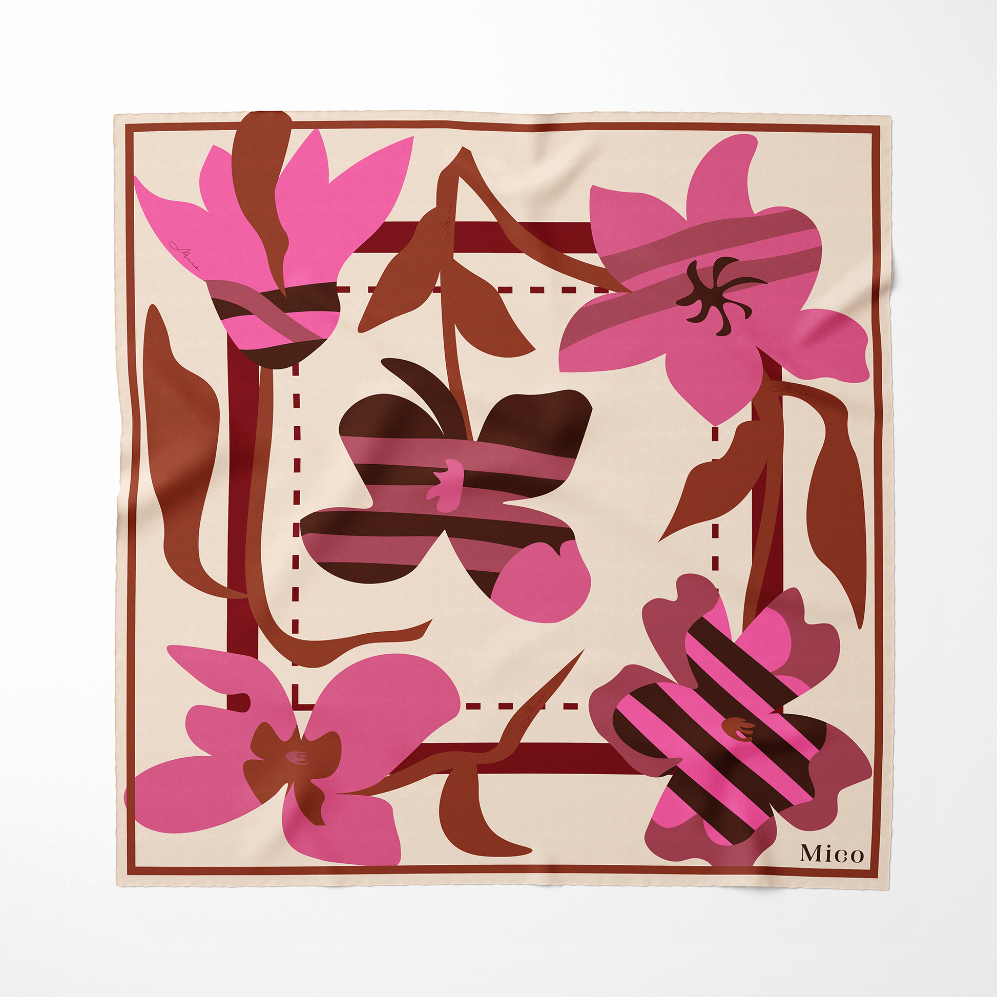 Retro Bloom takes the classic floral motif and abstracts it into a modern, confident statement. Crafted from 100% silk twill in a rich 16mm weave, the design is a sophisticated study in visual contrast. Deep, earthy browns and crimsons anchor the print, while electric pinks—rendered with sharp, graphic stripes—provide the ultimate visual tension. This is an effortless clash of organic form and geometric edge. It's the must-layer piece that redefines femininity and adds instant, bold attitude to your seasonal look.